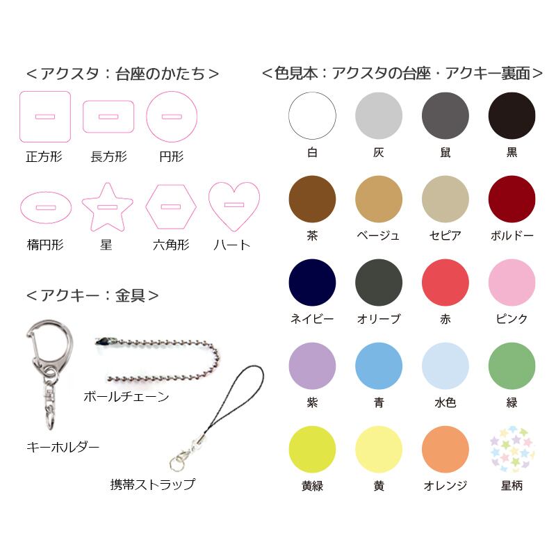 仕様: オーダーメイド、アクリルキーホルダー、名入れ、切り抜き加工、両面印刷、高品質、選べる金具、手作業