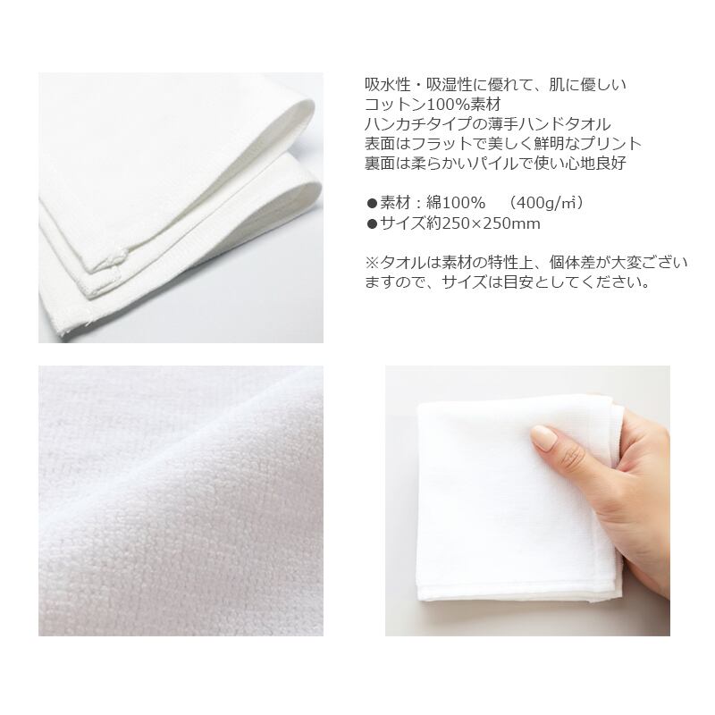 吸水性・吸湿性に優れて、肌に優しいコットン100%素材のハンカチタイプの薄手ハンドタオル